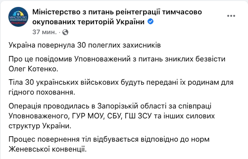 Операция проводилась в Запорожской области при сотрудничестве Уполномоченного, Главного управления разведки Минобороны, СБУ, Генштаба ВСУ и других силовых структур Украины в соответствии с нормами Женевской конвенции.