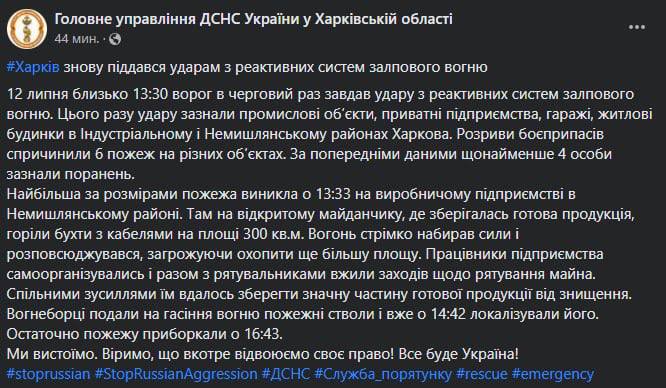 Как сообщает ГСЧС в Харьковской области, удар пришелся по промышленным объектам, частным предприятиям, гаражам, жилым домам в Индустриальном и Немышлянском районах Харькова. Разрывы боеприпасов вызвали шесть пожаров на разных объектах.