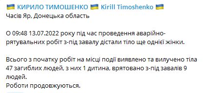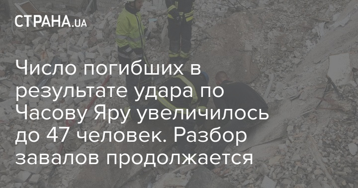 В среду, 13 июля, количество погибших после ракетного удара РФ по Часов Яру в Донецкой области увеличилось до 47.