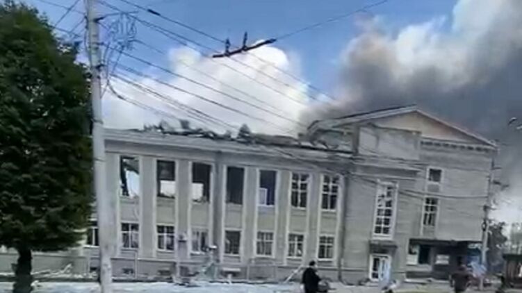 На кадрах видны густые клубы дыма. Во многих зданиях и магазинах вылетели окна. На улицах полно осколков и обломков разрушенных зданий.
