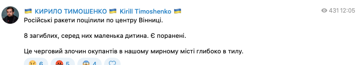 В результате утреннего (10:50) обстрела центра Винницы ракетами погибли уже 23 человека, в том числе трое детей. Удалось идентифицировать пока только шестерых погибших.