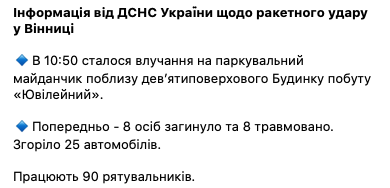 В Винницком горсовете сообщают, что для поиска людей, которые могли пострадать в результате ракетного удара в Виннице, открыта горячая линия: 67-01-20, 103.