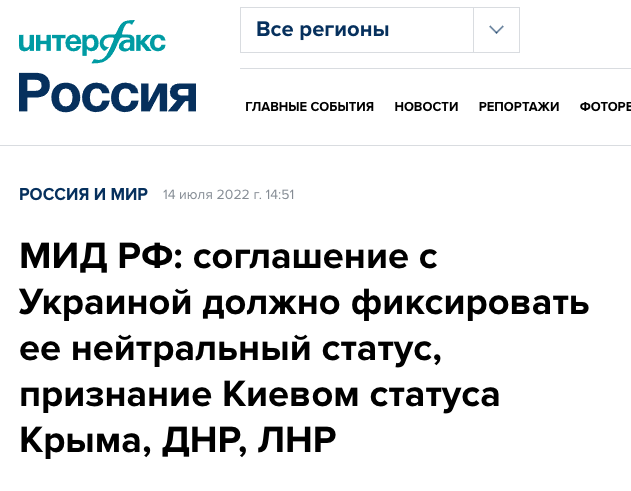 Он также сказал, что будущее мирное соглашение с Украиной, как считает Россия, должно зафиксировать нейтральный, внеблоковый и безъядерный статус Украины.