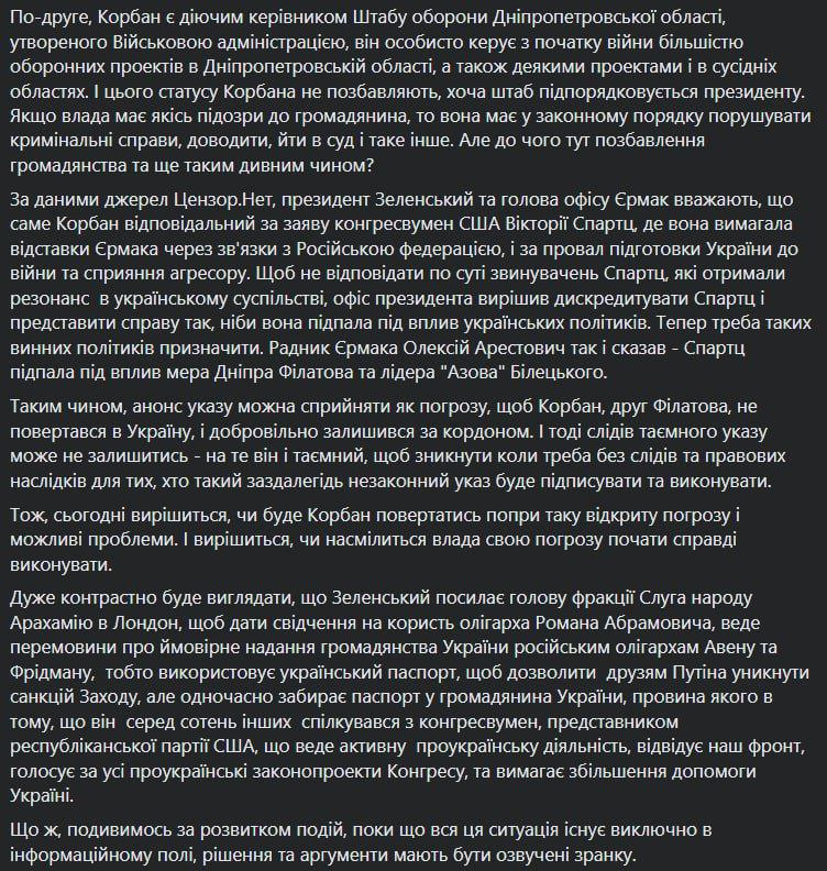 "Президент Зеленский и глава офиса Ермак считают, что именно Корбан ответственен за заявление конгрессвумен США Виктории Спартц, где она требовала отставки Ермака из-за связей с Российской Федерацией, и за провал подготовки Украины к войне и содействие агрессору", - написал Бутусов в Facebook.