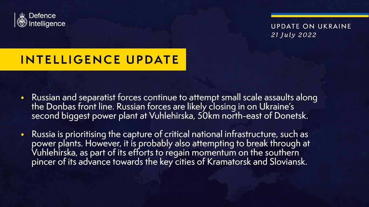 Российские войска и оккупационные силы продолжают попытки мелкомасштабных атак вдоль линии фронта на Донбассе. Российские силы, вероятно, приближаются к второй по величине электростанции Украины - Углегорской ТЭС, в 50 км к северо-востоку от Донецка.