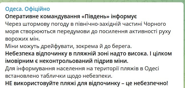 "Мины могут дрейфовать, в том числе и к берегу. Опасность отдыха в пляжной зоне слишком высока. И вполне вероятен неконтролируемый взрыв мин", - говорится в сообщении.