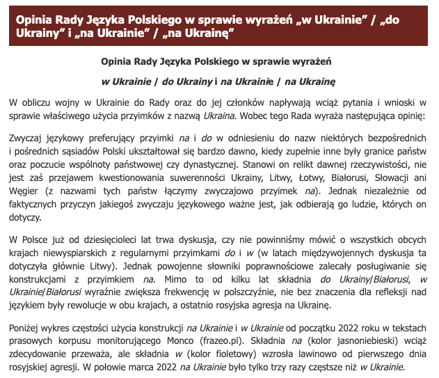 "Принимая во внимание особую ситуацию и особые чувства наших украинских друзей, которые часто воспринимают высказывания "на Украине", "на Украину" как признак отношения к своей стране как к несуверенной, Совет польского языка поощряет использование синтаксической формы "в Украине" и "в" Украину" и не считает форму с "на" единственно правильной (как вы можете прочитать в печатных изданиях о правильности)", - заявили в Совете польского языка.