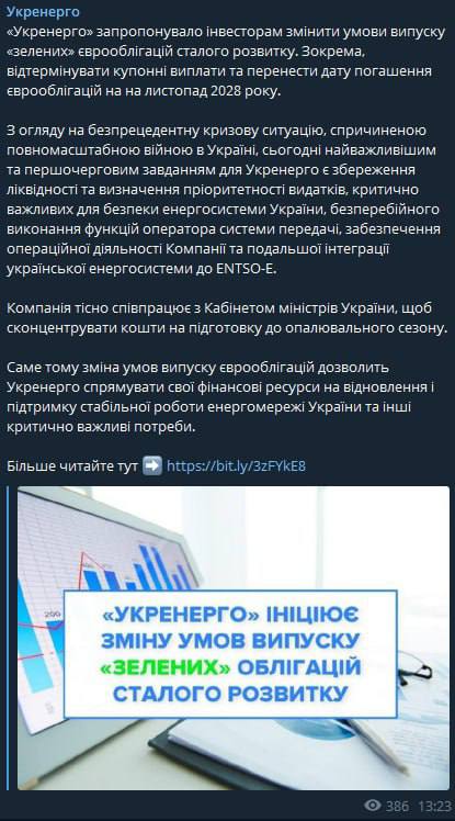 "Укрэнерго" предложило инвесторам отсрочить купонные выплаты и перенести дату погашения "зеленых" еврооблигаций устойчивого развития на ноябрь 2028 года.