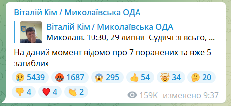 После того, как войска РФ ударили кассетными снарядами рядом с остановкой в Николаеве утром 29 июля, погибли 5 человек, еще 7 - ранены. Об этом сообщил глава области Виталий Ким.