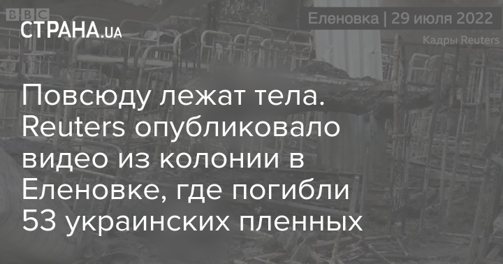 Агентство Reuters опубликовало видеорепортаж из временно неподконтрольной Еленовки Донецкой области, где в результате обстрела погибли 53 украинских военнопленных.
