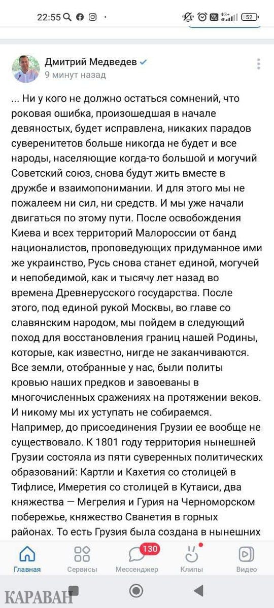 Напомним, пост о том, что Россия "пойдёт в следующий поход для восстановления границ" был опубликован на официальном аккаунте Медведева в "Контакте", но после оперативно удален.