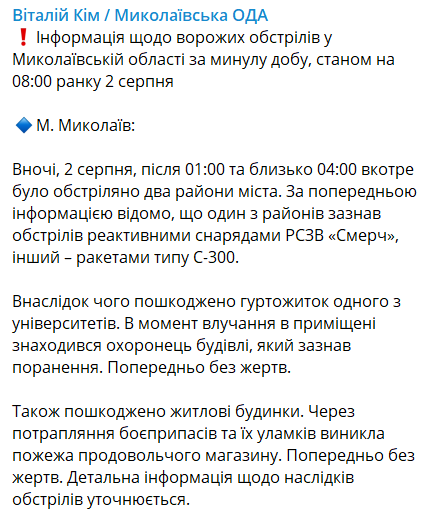 Николаев ночью с 1 на 2 августа обстреливали "Смерчами" и ракетами типа "С-300". Пострадали два района города.