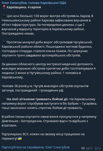 А в Чугуеве от прилета снаряда погиб 58-летний мужчина, сообщил глава Харьковской ОГА Олег Синегубов.