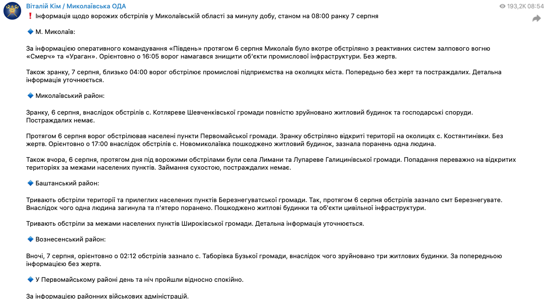 В Николаевской области за минувшие сутки один человек погиб и пятеро получили ранения в результате обстрела поселка Березнеговатое.