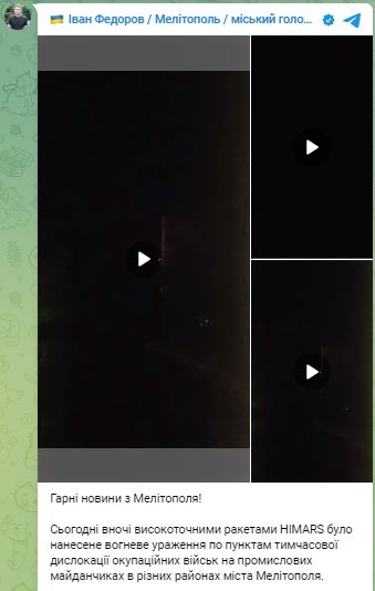 "На прошлой неделе значительную часть ПВО оккупанты передислоцировали из Мелитополя в Херсон. Сегодняшняя ночь наиболее результативна и свидетельствует, что существующие вражеские подразделения ПВО уже не способны сопротивляться HIMARS. Ослабление системы ПВО создает необходимые предпосылки для успешного контрнаступления на мелитопольском направлении" - написал Федоров.
