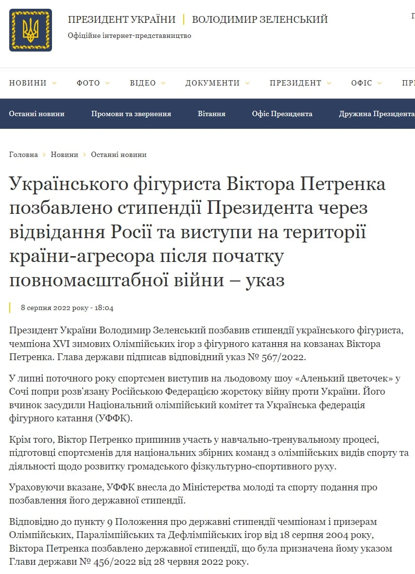 Президент Украины Владимир Зеленский лишил президентской стипендии чемпиона зимних Олимпийских игр 1992 года по фигурному катанию Виктора Петренко. Причина - его выступление в России, которое произошло после начала полномасштабного вторжения.