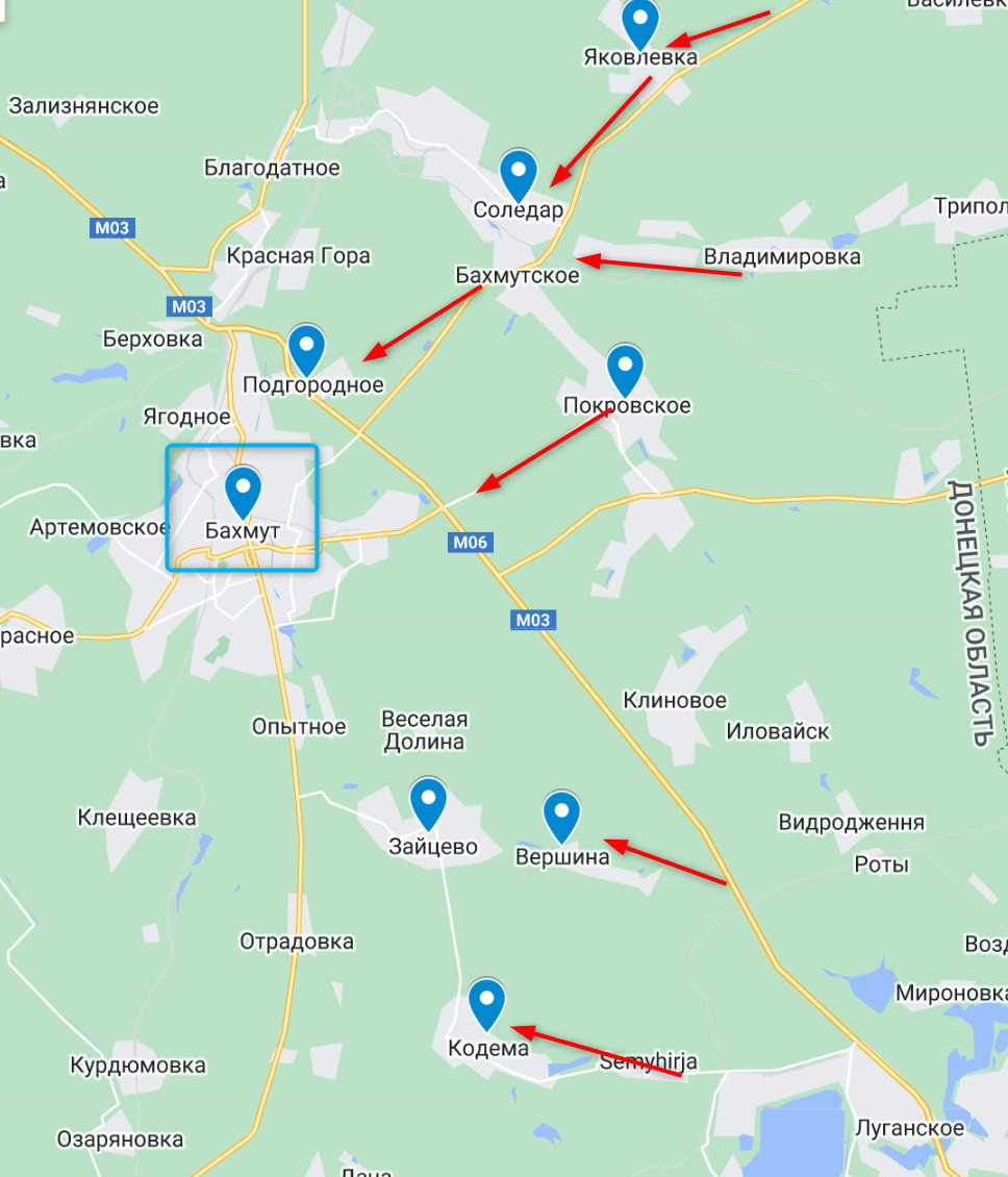 Учитывая, что ранее сообщалось об атаках со стороны Покровского на востоке, можно говорить, что Бахмут атакуют со всех сторон, кроме запада.
