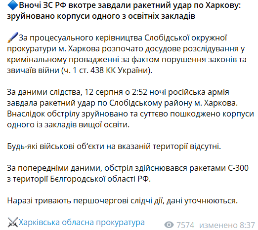 Слободская окружная прокуратура Харькова начала досудебное расследование в уголовном производстве по факту нарушения законов и обычаев войны (ч. 1 ст. 438 УК Украины). По данным следствия, российская армия нанесла ракетный удар по Слободскому району Харькова 12 августа в 02:52. В результате обстрела разрушены и существенно повреждены корпуса одного из учреждений высшего образования. Какие-либо военные объекты на указанной территории отсутствуют. В прокуратуре подтверждают, что обстрел производился ракетами С-300 с территории Белгородской области РФ.