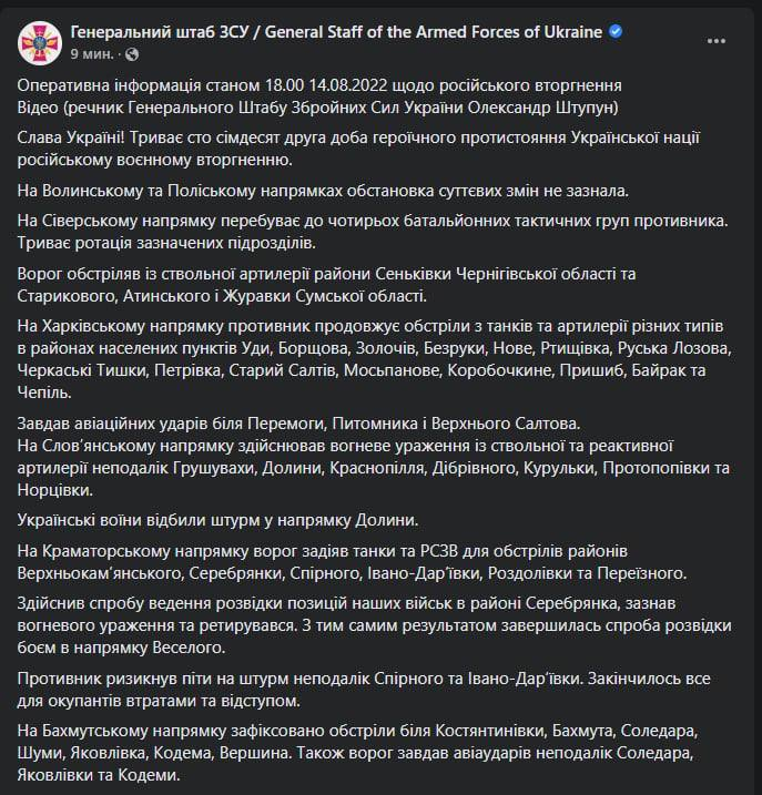 В воскресенье, 14 августа, в Украине идет уже 172-й день войны с Россией.