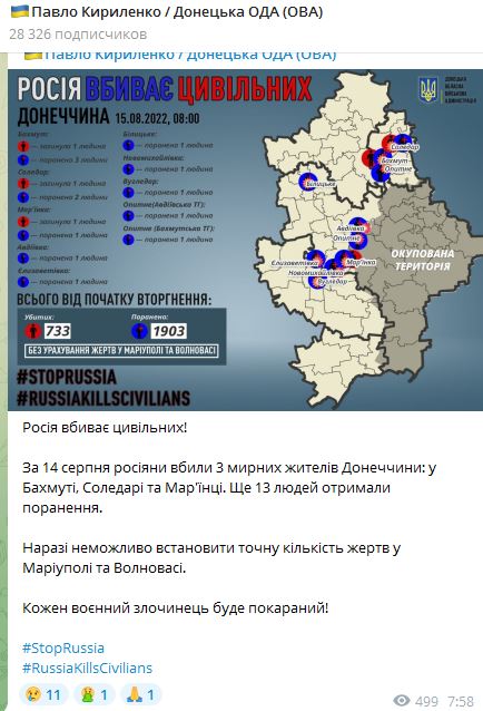 08:01 За 14 августа россияне убили трех мирных жителей в Донецкой области: в Бахмуте, Соледаре и Марьинке. Еще 13 человек получили ранения.