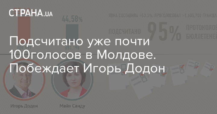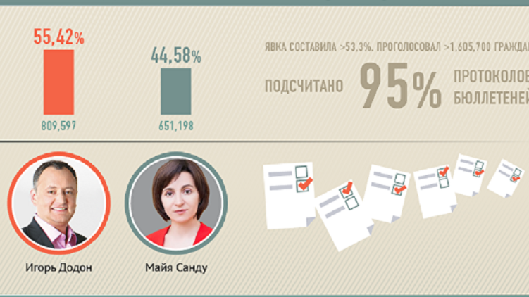 Председатель Партии социалистов Игорь Додон набирает 55,15% голосов избирателей. Его оппонент от Партии "Действие и солидарность Майя Санду набирает 44,85%.