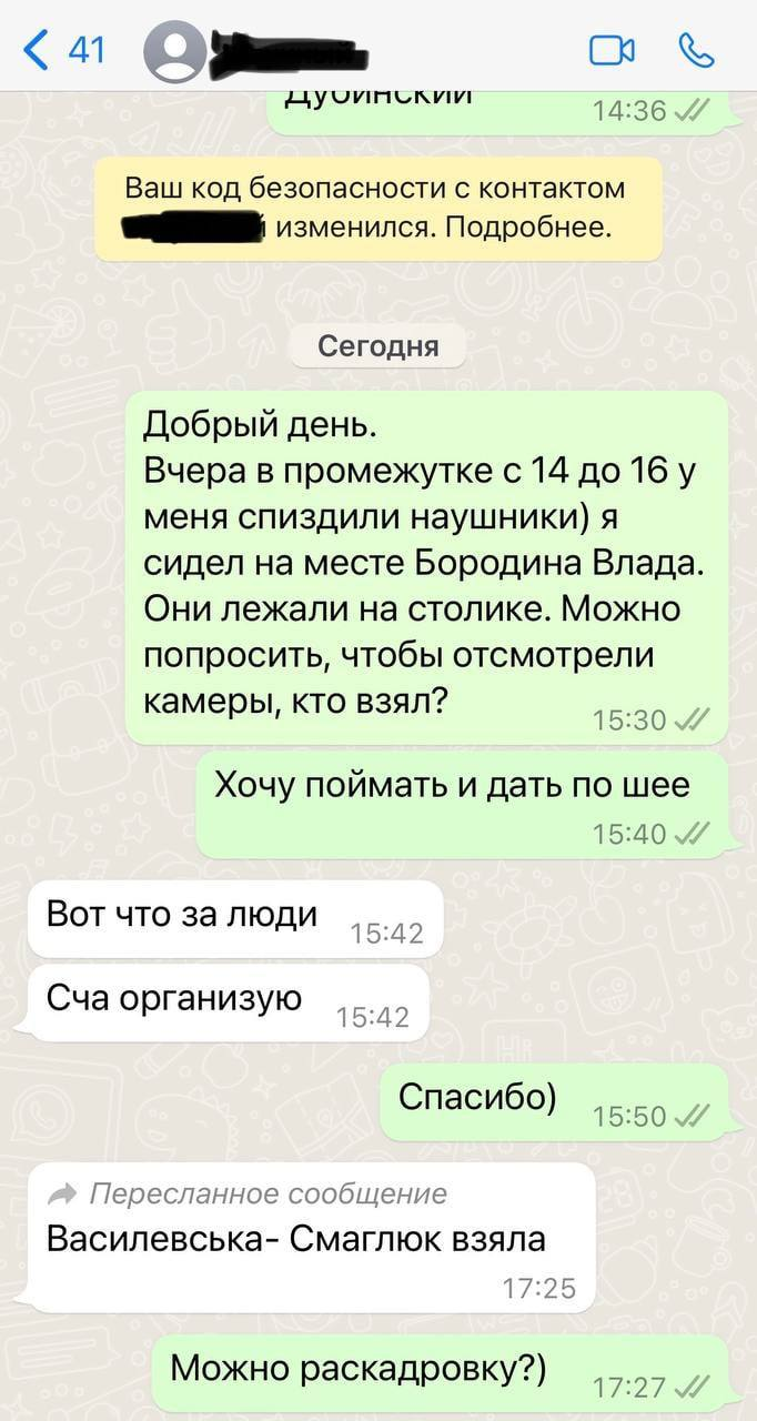 "Если бы Дубинский сидел на своём месте, он бы их не потерял. Наушники лежали не на месте Дубинского, а на месте моего уважаемого коллеги Владислава Бородина. Чтобы Бородин не потерял дорогую вещь, я ее забрала из зала парламента, чтобы наушники никуда не пропали. А когда оказалось, что это не его наушники, я их передала Вячеславу Рублеву, потому что с Дубинским не общаюсь уже два года. Не общаюсь и очень этому рада. И хочу поставить Дубинского на место, чтобы он сидел на своём месте, а не на месте своих коллег, и не мешал другим работать", — заявила "Стране" Василевская-Смаглюк.