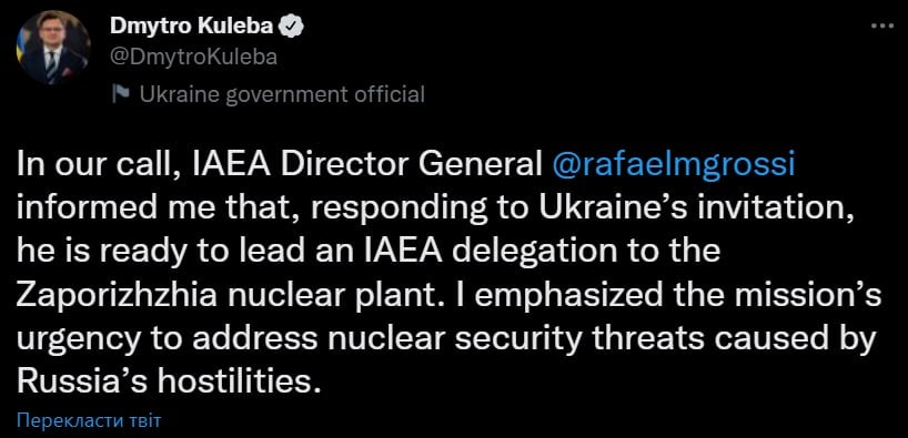 "Во время нашего звонка Гросси сообщил мне, что, отвечая на приглашение Украины, он готов возглавить делегацию МАГАТЭ на Запорожскую АЭС. Я настоял на срочности работы миссии по угрозам ядерной безопасности, спровоцированными военными действиями РФ", - написал Кулеба.