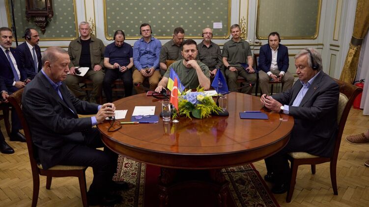 Ранее Зеленский подвел итоги переговоров во Львове с Эрдоганом и Гутерришем. Упомянул визит миссии МАГАТЭ на Запорожскую АЭС, украинских военнопленных, готовность Турции взять под патронат восстановление Харькова и области и свой призыв к Эрдогану и Гутерришу быть максимально жесткими в отношении псевдореферендумов, которые готовит Россия на оккупированных территориях.