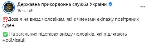 "На общих основаниях выезда мужчин, подлежащих мобилизации", - говорится в сообщении ГПСУ.
