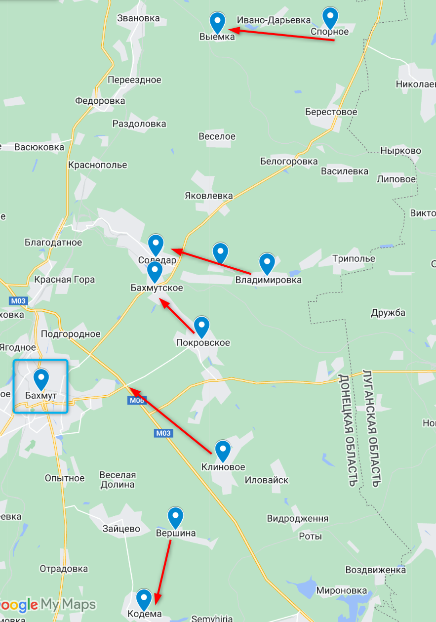 2. Под Северском и Бахмутом противник вел наступательные бои в направлениях: Спорное – Выемка, Стряповка – Соледар, Владимировка – Соледар, Клиново – Бахмут, Вершина – Кодема.