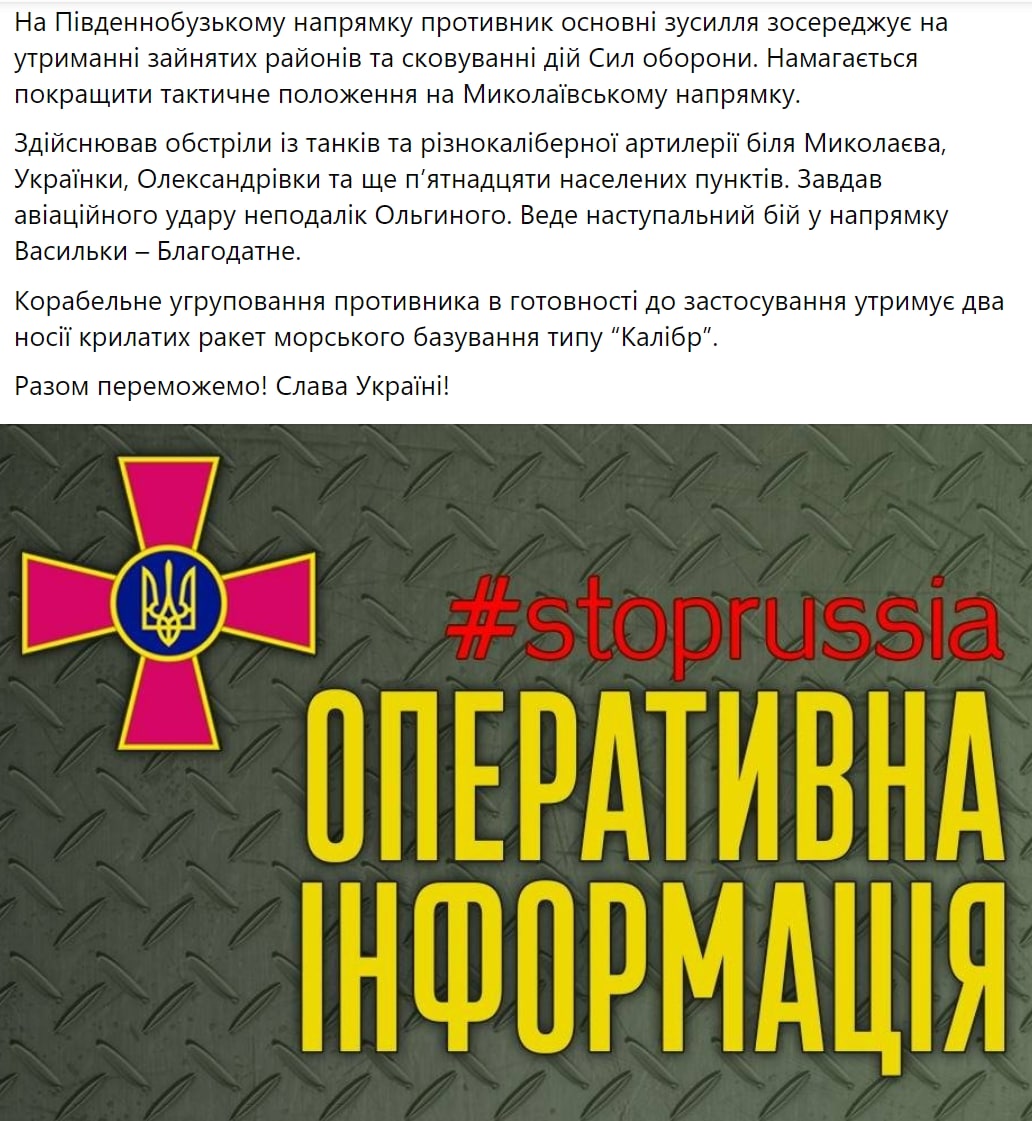 6. на Южнобужском направлении ведется наступательное сражение в направлении Васильки – Благодатное.