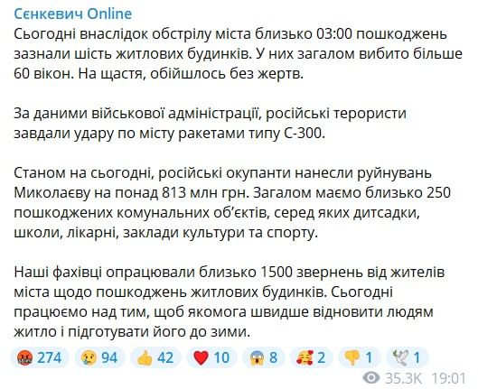 Сенкевич рассказал, что в результате обстрела Николаева в 03:00 20 августа были повреждены шесть жилых домов, в них выбито более 60 окон. Удар наносился ракетами С-300.