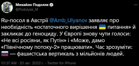 "Постпред РФ в Австрии Михаил Ульянов заявляет о необходимости "окончательного решения украинского вопроса" и призывает к геноциду. Снова услышали в Европе: "Не все россияне такие как Путин" и "Нужно дать поработать Северному потоку-2". Время понять: РФ - это фашистская вертикаль миллионов людей", - написал Подоляк.
