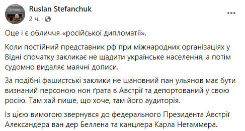 Стефанчук призвал признать постпреда РФ в Вене персоной нон-грата за призывы "не щадить украинцев"