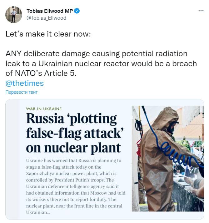 А член британского парламента Тобиас Эллвуд заявил: "Любое преднамеренное повреждение украинского ядерного реактора с возможной утечкой радиации будет нарушением статьи 5 НАТО".