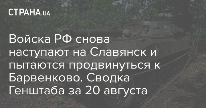 В Генеральном штабе Вооруженных Сил Украины опубликовали оперативную сводку с фронта по состоянию на 18:00 20 августа. Сообщается, что российские войска пытаются продвигаться к Барвенково и возобновили наступление на Славянском направлении.