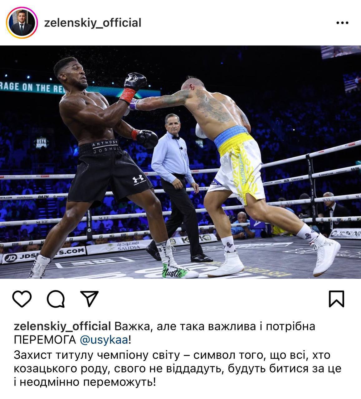 Президент Украины Владимир Зеленский поздравил украинского чемпиона, обладателя поясов WBO, WBA, IBF и IBO в супертяжелом весе Александра Усика, который защитил свои титулы в реванше с британцем Энтони Джошуа и посвятил победу ВСУ.