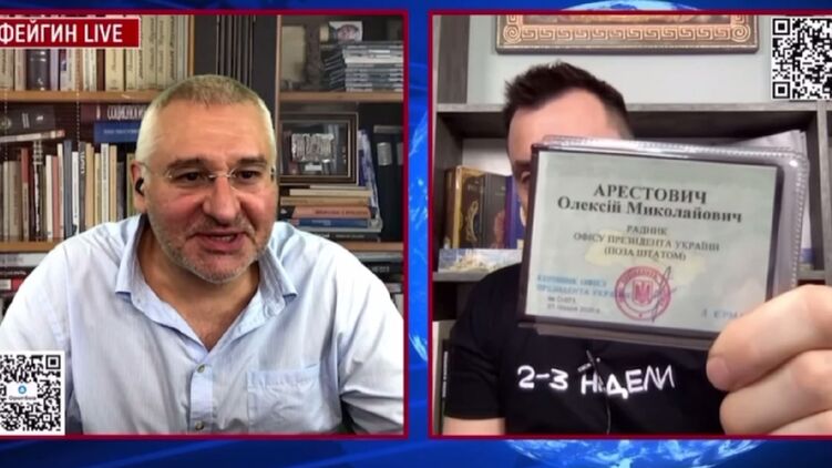 В продолжение вчерашних споров о том, работает ли Арестович на Банковой, он показал свое удостоверение внештатного советника Офиса президента в эфире у Марка Фейгина.