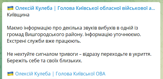 По его словам, известно о нескольких звуках взрывов в одной из громад Вышгородского района. Информация уточняется.