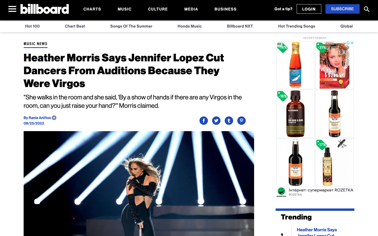Американская актриса Хизер Моррис рассказала изданию Billboard забавную историю о певице Дженнифер Лопес. По словам актрисы, однажды голливудская селебрити во время отбора танцоров для своего тура руководствовалась гороскопом.