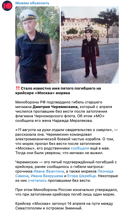 Министерство обороны РФ подтвердило гибель на крейсере "Москва" старшего мичмана Дмитрия Черемискина. Это пятый подтвержденный погибший из экипажа бывшего флагмана Черноморского флота.