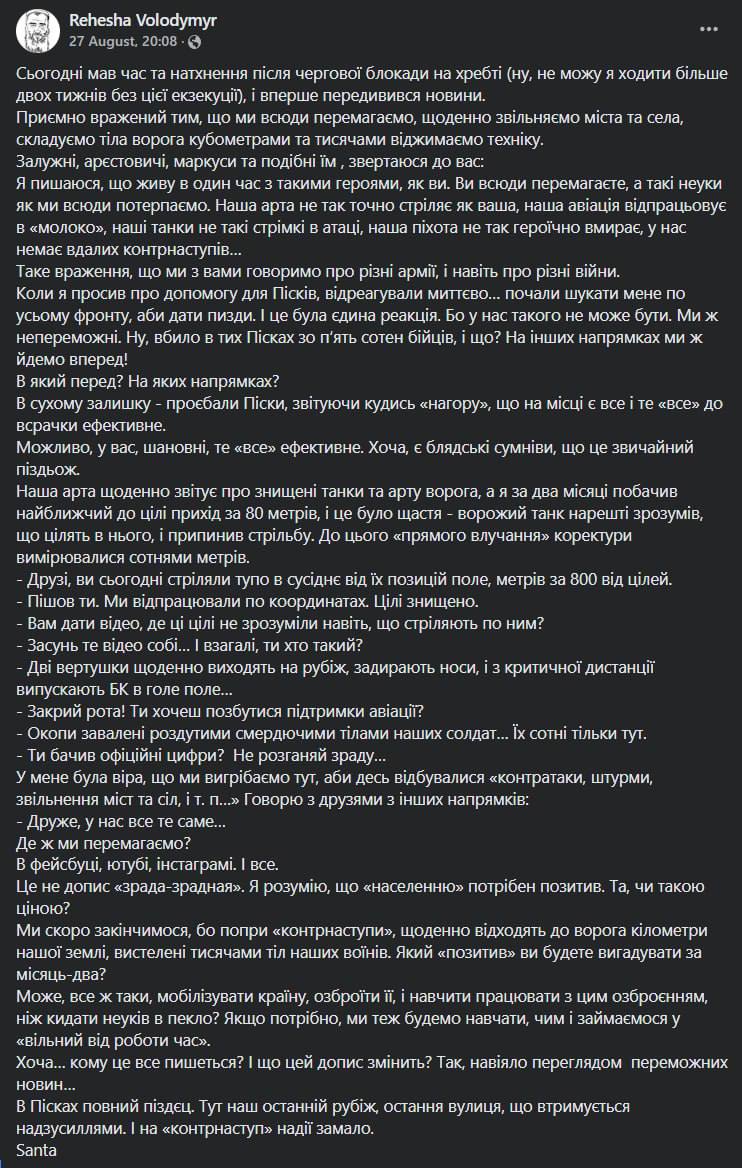 "Приятно поражен тем, что мы повсюду побеждаем, ежедневно освобождаем города и села, складываем тела врага кубометрами и тысячами отжимаем технику. Залужные, Арестовичи, Маркусы и подобные им, обращаюсь к вам: Я горжусь, что живу в одно время с такими героями, как вы. Вы повсюду побеждаете, а такие невежды как мы повсюду страдаем. Наша арта не так точно стреляет как ваша, наша авиация отрабатывает в «молоко», наши танки не так стремительны в атаке, наша пехота не так героически умирает, у нас нет удачных контрнаступлений", - написал он.