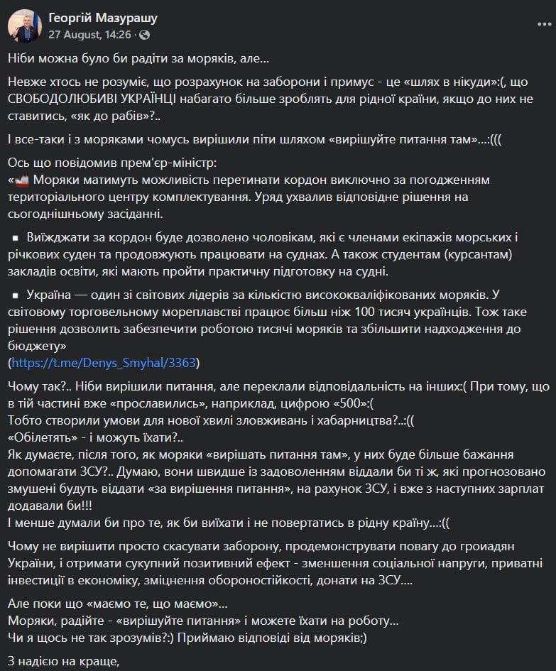 10:50 Нардеп Георгий Мазурашу раскритиковал в Facebook решение правительства разрешить выезд за границу морякам по согласованию военкоматов.