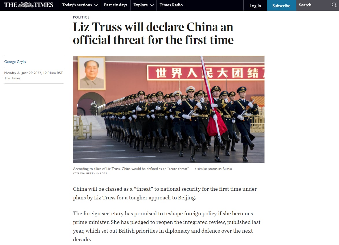 11:38 Глава МИД Великобритании Лиз Трасс намерена впервые объявить Китай "угрозой" для нацбезопасности страны, если станет премьер-министром.
