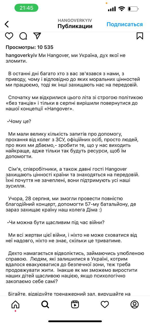 21.55 Уже есть реакция ресторана Hangover на видео, на котором возмущаются тусовкой около заведения во время войны.