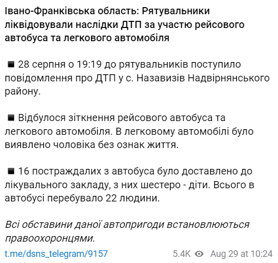 В воскресенье, 28 августа, в Ивано-Франковской области произошло ДТП с участием автомобиля и рейсового автобуса, в котором находились 22 пассажира. 16 человек получили ранения, в том числе дети, водитель легковушки погиб.