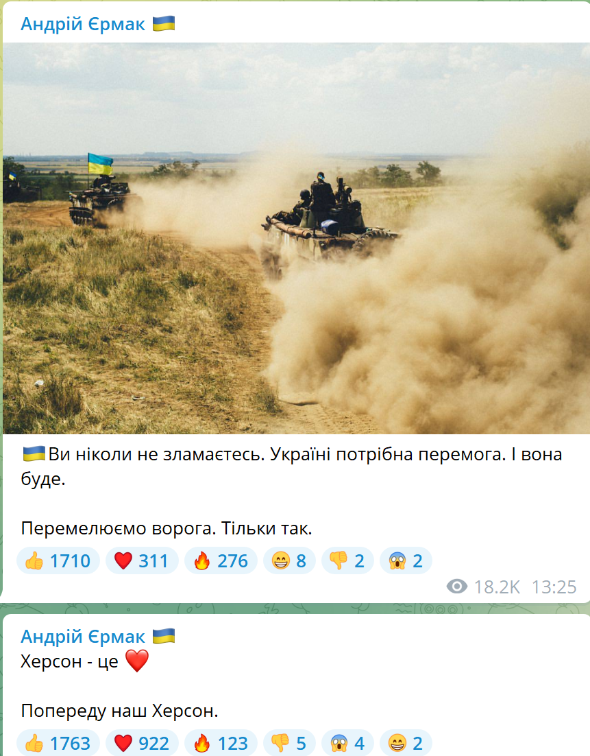 Затем глава Офиса президента Андрей Ермак опубликовал пост с намеком на некие события августа: "И погибнут наши враги, как роса на солнце. Под палящим небом украинского августа". Затем у него вышло еще несколько таких "намекающих" постов, среди которых был: "Херсон - это любовь. Впереди наш Херсон".