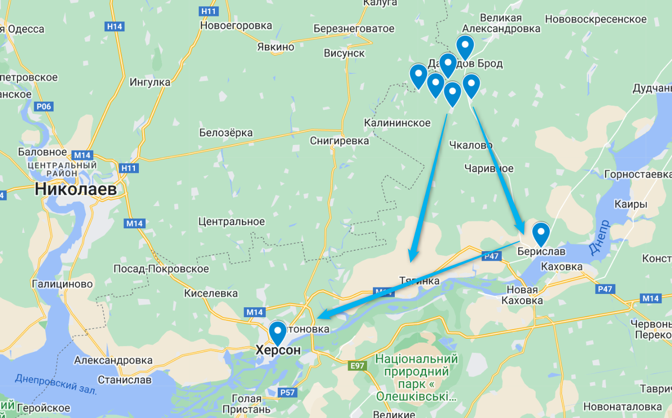 Если основное направление - Давыдов Брод, то генеральный план может состоять в движении в сторону Новой Каховки на Берислав, который активно сейчас обстреливается. Это позволило бы вклиниться в российскую группировку на правобережье Днепра и отсечь российские войска, которые действуют в направлении Кривого Рога от основных сил на юге. После чего начать наступление и на сам Херсон в том числе и вдоль Днепра (то есть с северо-востока).