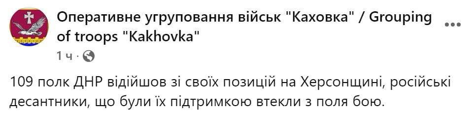 Что говорят власти Украины. Днем оперативная группировка украинских войск "Каховка" опубликовала пост о том, что 109-й полк "ДНР" отошел со своих позиций в Херсонской области. А российские десантники, которые прибыли для поддержки, бежали с поля боя.