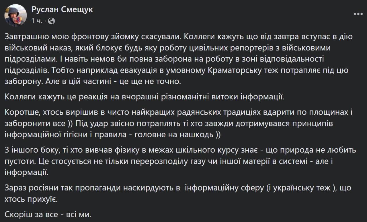 "Коллеги говорят, что с завтрашнего дня вступает в действие военный приказ, который блокирует любую работу гражданских репортеров (есть еще военные журналисты - Ред.) с военными подразделениями. И даже как бы полный запрет на работу в зоне ответственности подразделений. То есть, например, эвакуация в условном Краматорске тоже попадает под этот запрет. Но в этой части – это еще не точно", - заявил он.